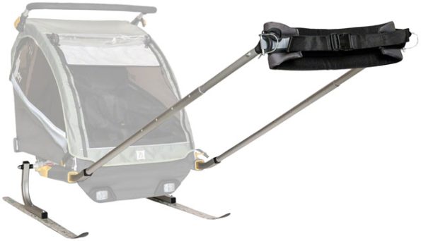 Perfect for cross country skiing or snow shoeing, the Ski Kit attaches to the wheel axle with a push button system. The adjustable, lightweight tow bars connect to the trailer side mounts and lead to a padded hip harness. Tow bars connect to the harness where multiple attachment points allow for a perfect fit.