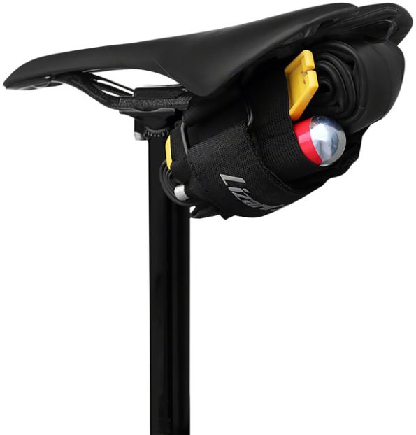 The L-Caddy sports fitted pockets for a patch kit, tire levers, multi tool and cash, as well as a main cargo area for up to two spare tubes.