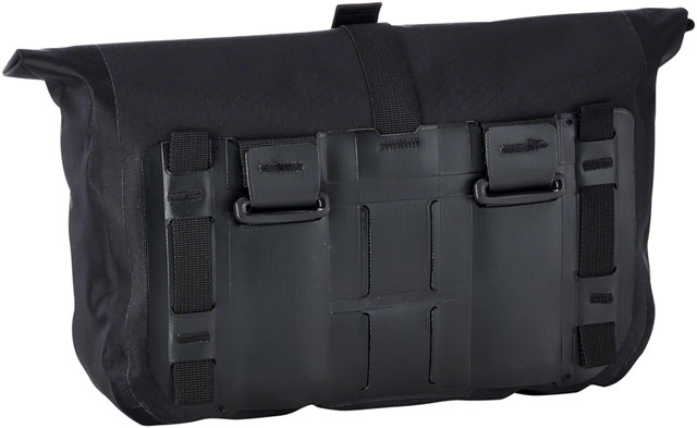 Structural rigidity is provided by an internal stiffener, a compact pack is guaranteed at all times due to the side-release tension and buckle system. An additional hard shell back provides further rigidity and a MOLLE adjustable headtube retention system guarantees a secure fit to your bike.