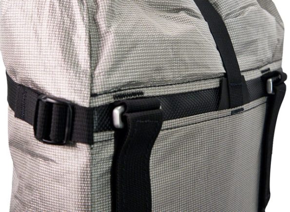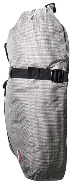When you need the cargo capacity that a rack provides, but need something that won’t get in your way when the going gets rowdy, Nano Panniers are the ticket. At only 4″ wide the load stays tight to the bike on singletrack and will not get in your way on those nasty hike-a-bikes. An external compression system keeps the bag snug at various load levels. The tight spacing between the aluminum loop and strap prevents slop at the pannier rails. A bomber Voile nano strap with metal hardware provides tension at the bottom and gives versatility in mounting. Think of these bags as frame bag supplements that stay on your bike; designed to carry dense and heavy stuff like food, water, and fuel with a low profile form. Note: These panniers are not compatible with “T” style racks. They lack the load capacity and means for a lower attachment.