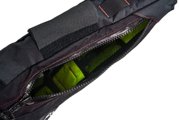 The Adventure Race Frame Bag has been designed as a durable and lightweight bag for ultra-distance riding, Audaxes and races. Using X21, a waterproof technical fabric, 6oz nylon lining and YKK zips, the bag gives easy access to your gear while on the move, while remaining light weight and inconspicuous. A Hypalon pocket cover and pockets on each side keep your things organized and easy to reach. Reflective detailing aids visibility during night riding, and an extra cable slot is also provided at the front of the bag for dyno wiring and charging. Reflective detailing adds visibility during night time riding.