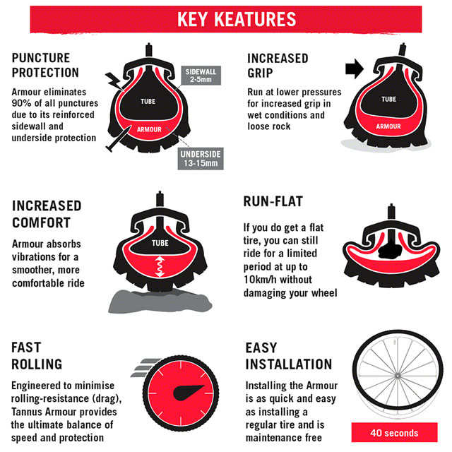 Tannus Armour is the ultimate in tire protection and performance for all levels and styles of riding. Sitting between your tire and inner tube, the Tannus Armour provides 15mm of puncture protection on the top, as well as 2mm of sidewall protection from sharp objects and rocks. Whether you are a city biker, adventure tourer or prefer the off-road, downhill or gravel trails, Tannus Armour gives you increased grip and vibration dampening for a smoother, more comfortable and enjoyable ride.